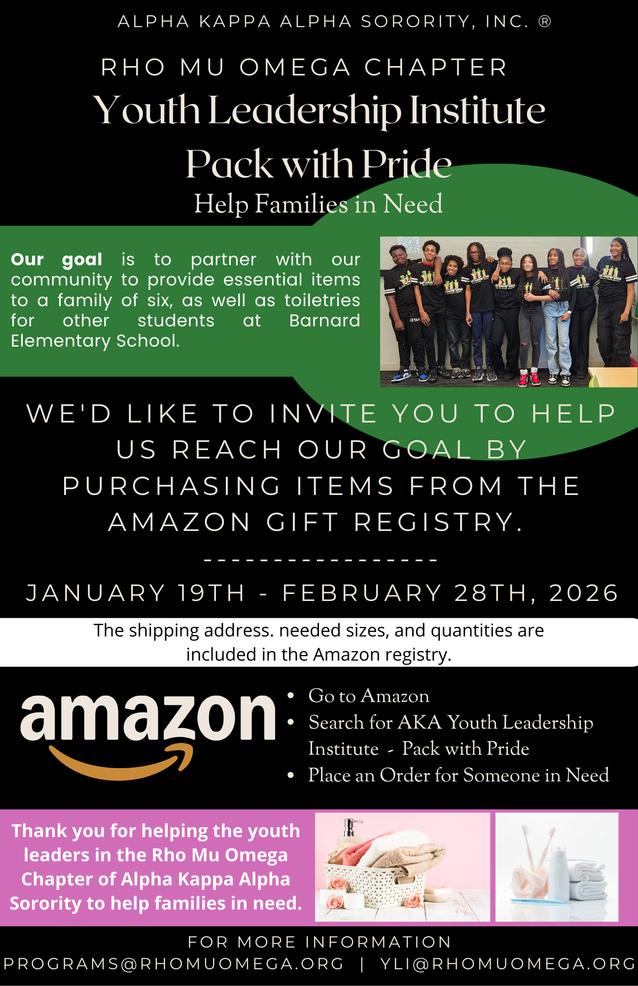 Members of Rho Mu Omega's Youth Leadership Institute are comprised of youth leaders aged 11-13 with a heart to serve. In addition to learning to set goals and immerse themselves in life skills, they planned a community service project that extends kindness and generosity to support families in need at Barnard Elementary School. One of the families is led by a single mother of 5 children. Other students at the school have ongoing needs for toiletry items.